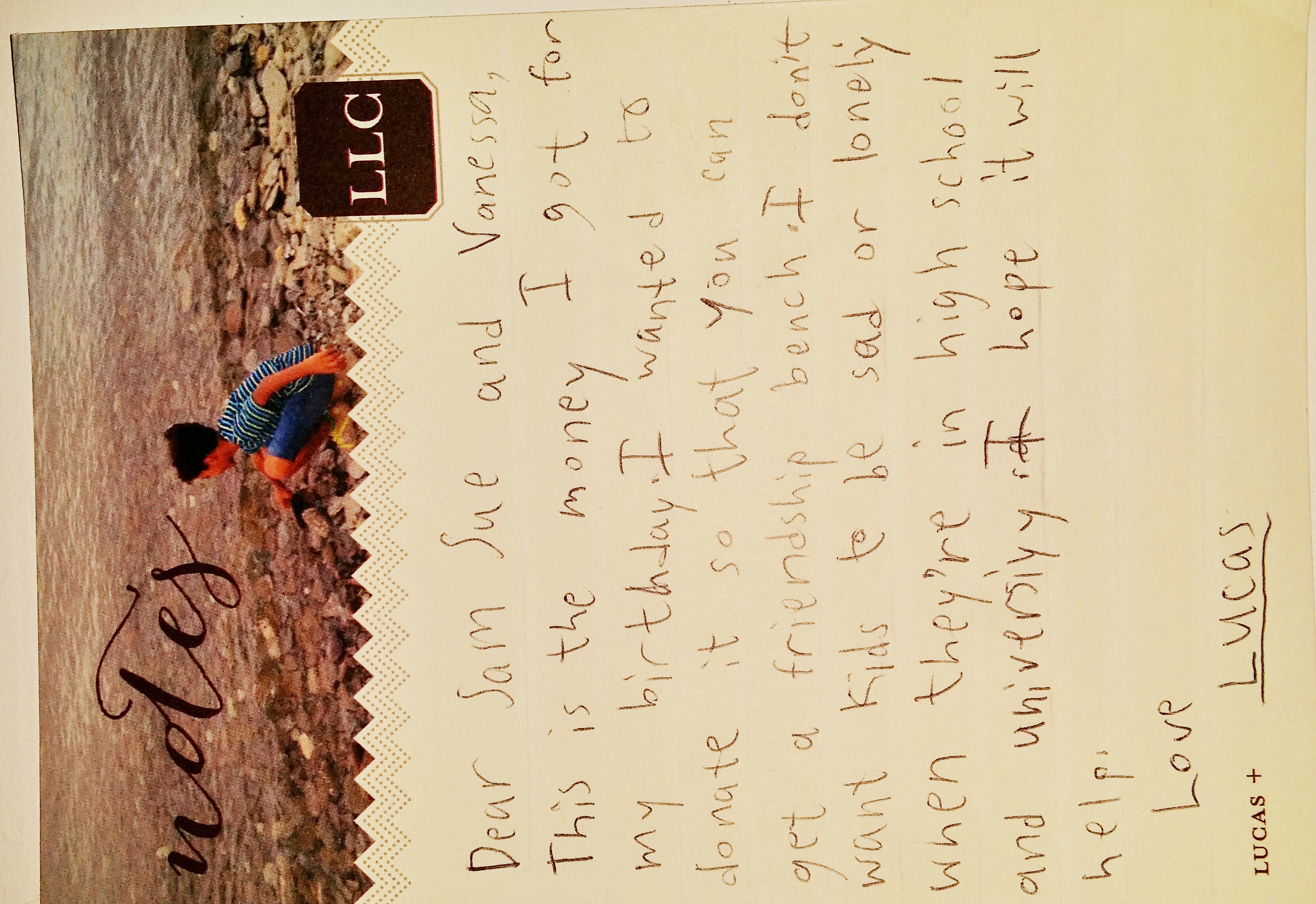 This morning Lucas and his mother visited The Lucas Fiorella Friendship Bench Co-Founder Sam Fiorella and his family to present his donation. Included was this heartfelt note:
