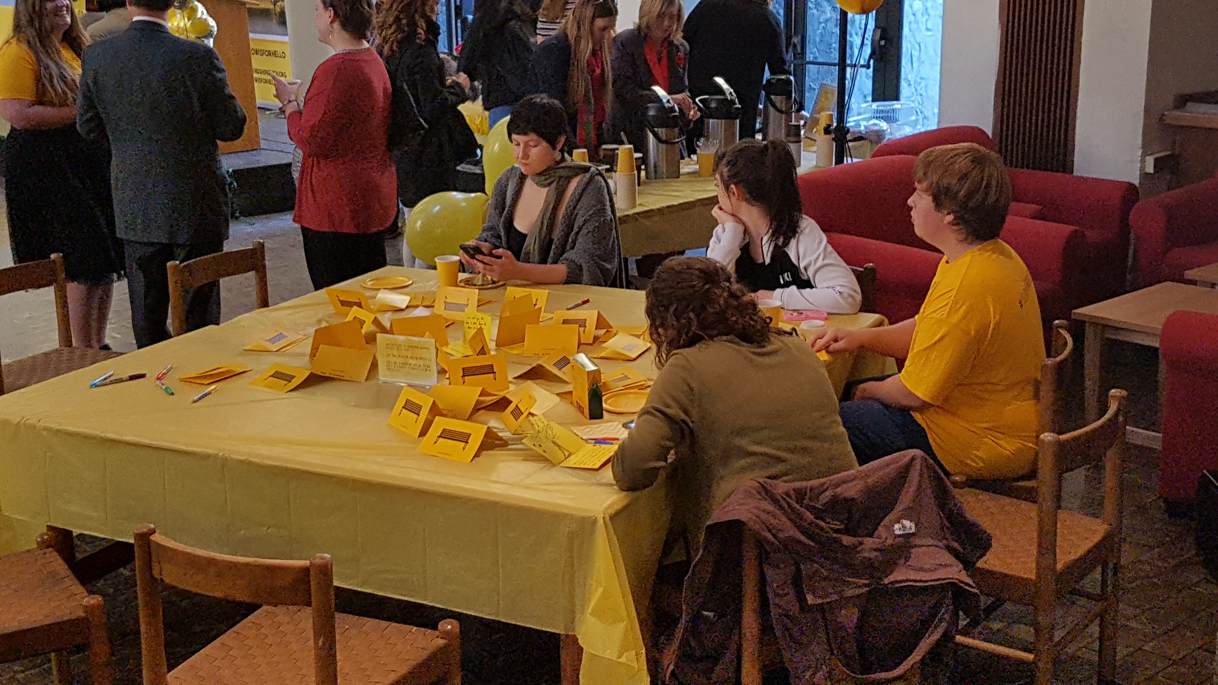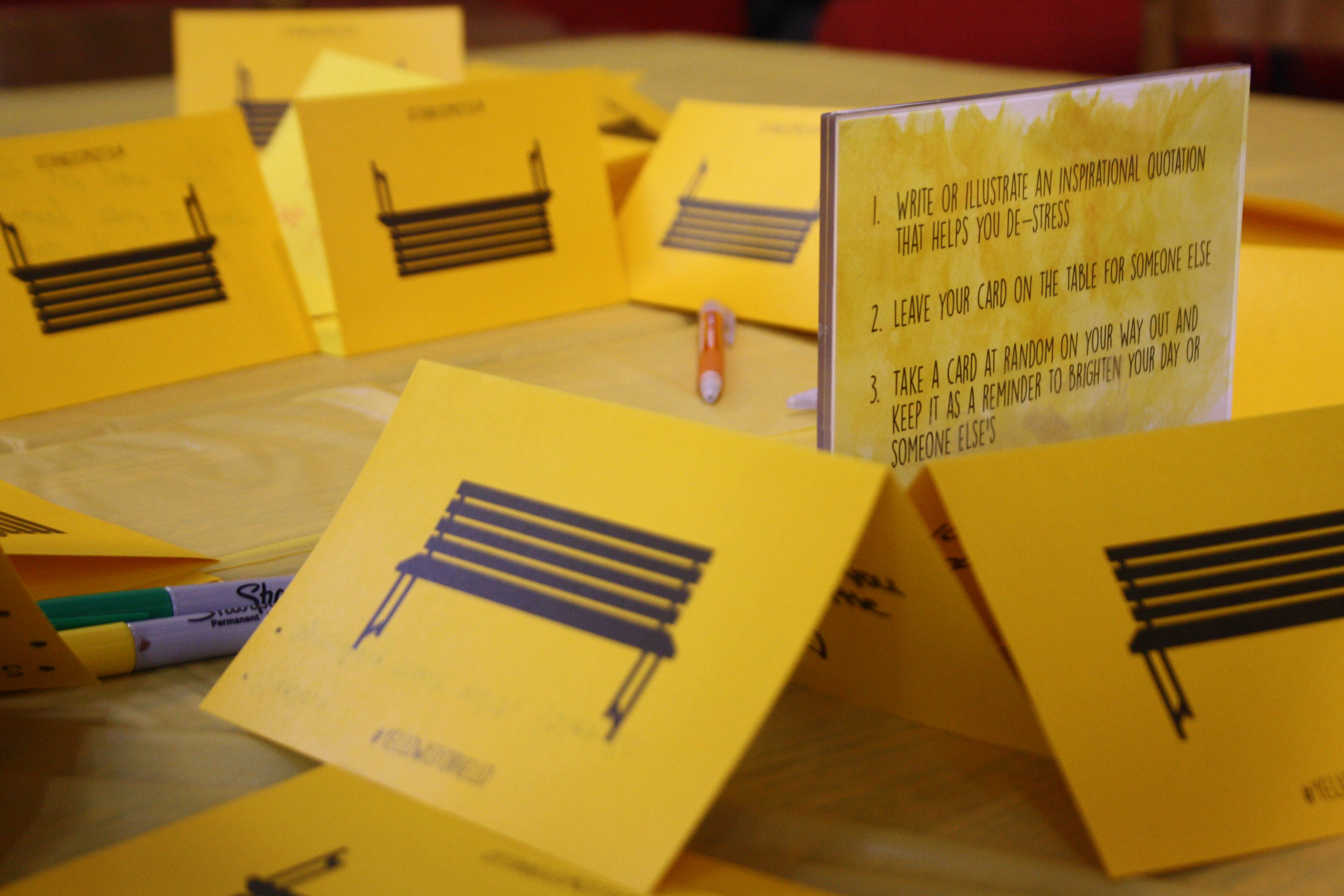 Within the Great Hall, various activity stations were set up to keep students engaged and talking about mental health. One of these was a community table where students were asked to write or illustrate inspirational messages to other students who may be suffering or just need a positive thought.