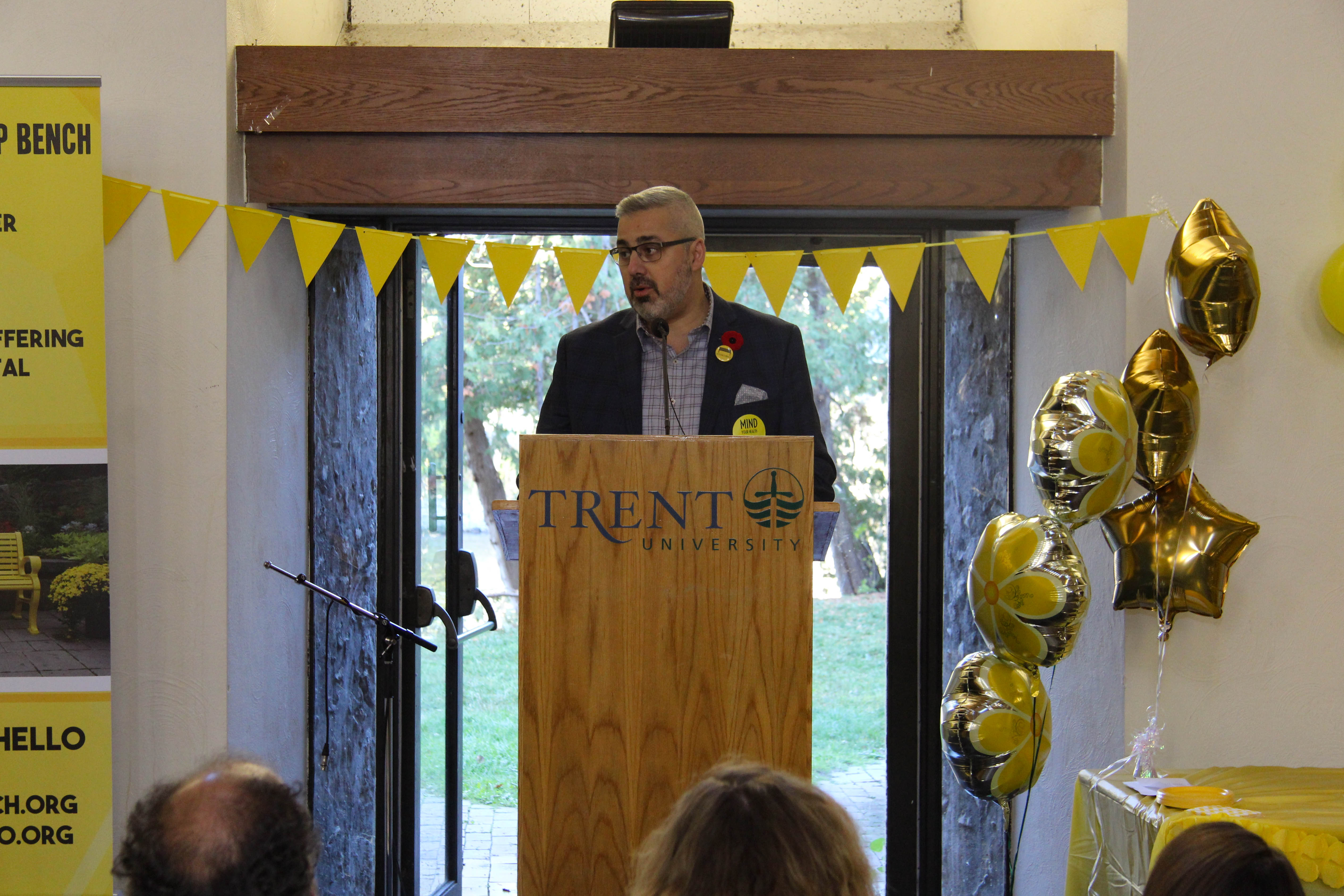 Getting down to business, members of the University’s Student Services spoke about the importance of mental health awareness and how to access available counselling services on campus. Next, our Co-Founder and Executive Director Sam Fiorella shared some personal stories about depression and how to manage stress while on campus before he dedicated The Lucas Fiorella Friendship Bench to current and future students of Trent University.