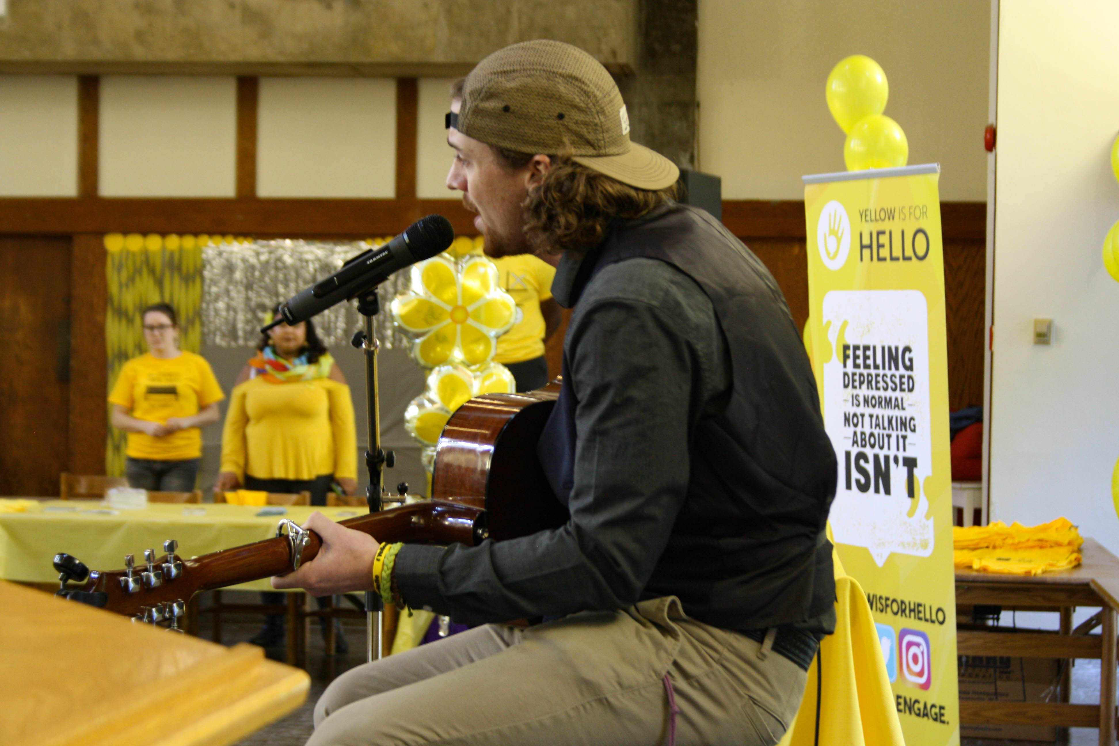 The event, held in Champlain College’s Great Hall, started with 30 minutes of music by a Trent student Duncan Ivany, who is also a member of the band Dickie and The Boys. Duncan played an acoustic set including reflective and inspiring songs appropriate for those gathering to learn more about mental health or for those who may be suffering.